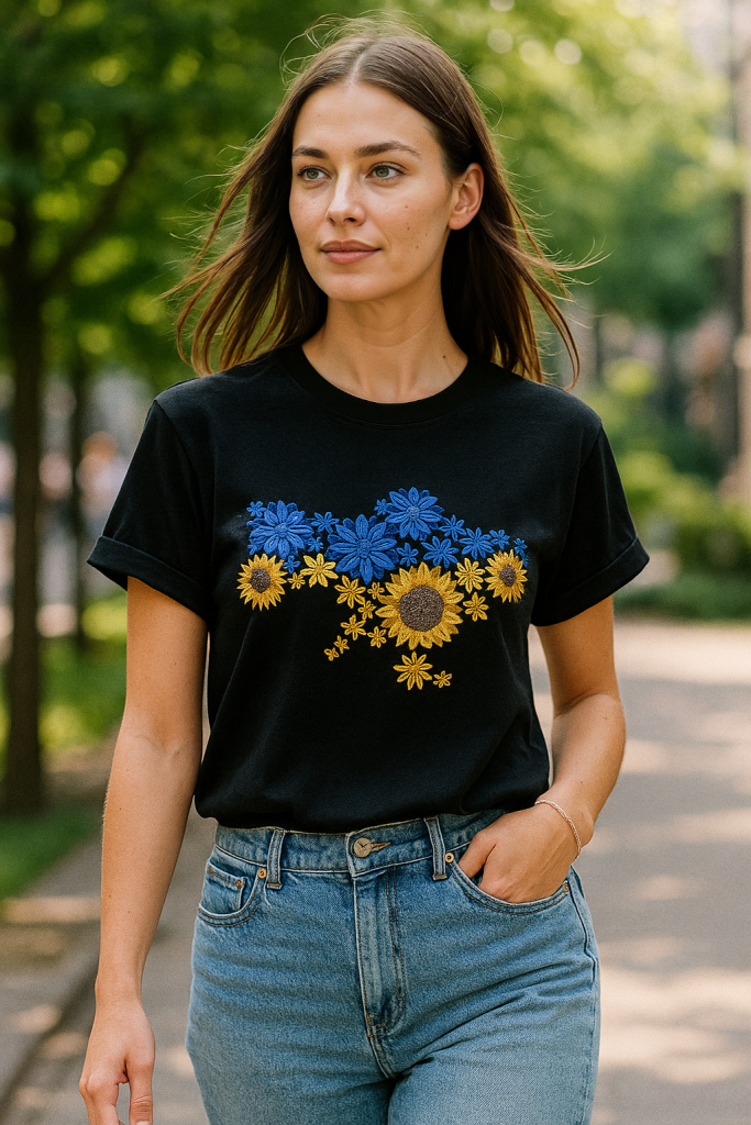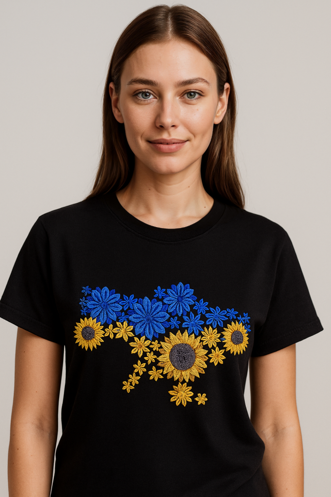 — чорна з картою України, створеною з синіх і жовтих квітів;