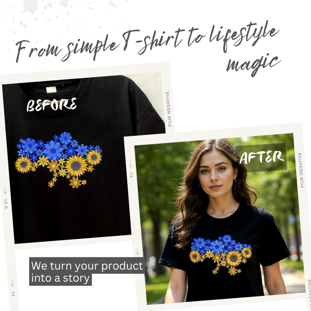 Сьогодні я покажу, як із простих фото футболок можна створити повноцінну fashion-зйомку — без моделей, студії чи камери.