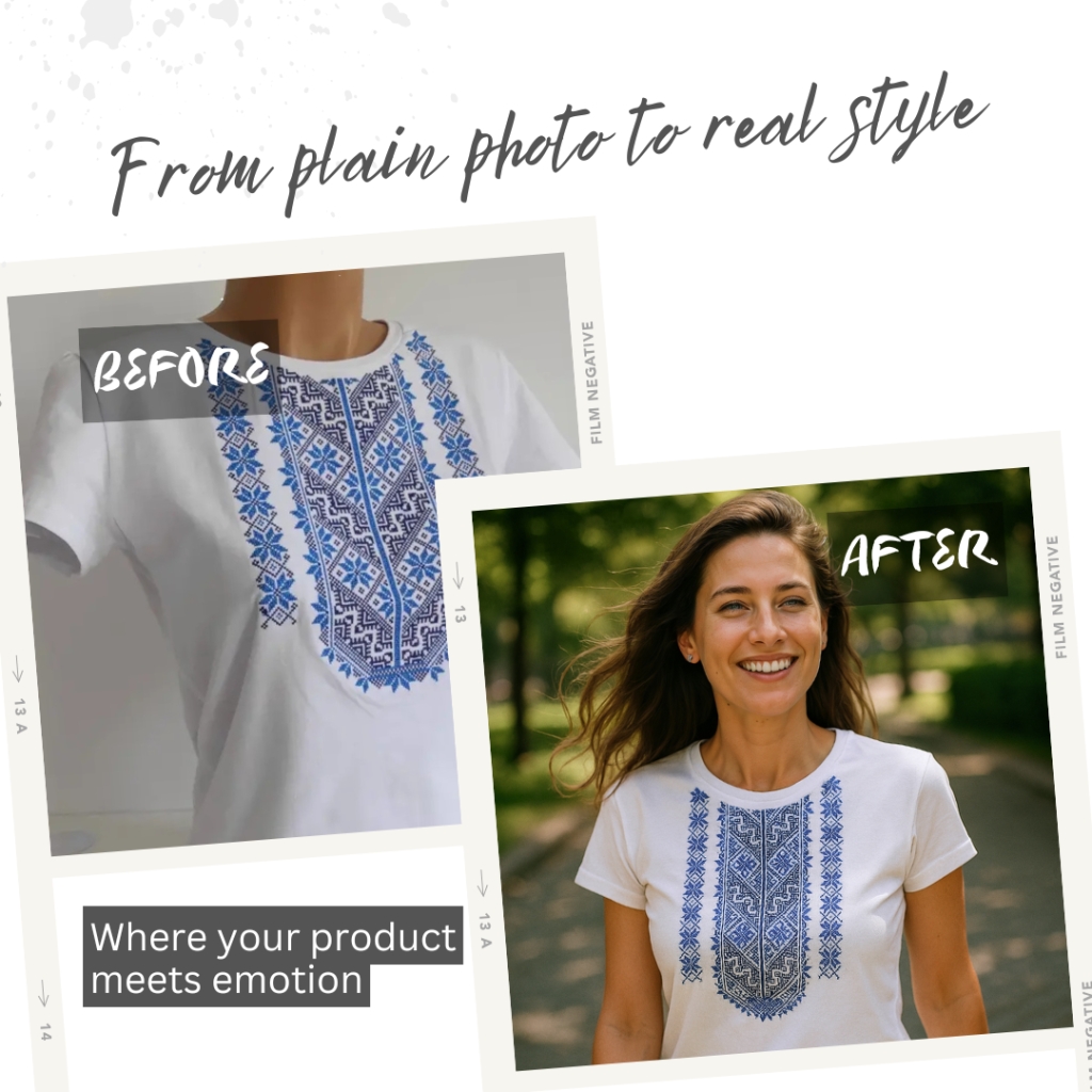 Сьогодні я покажу, як із простих фото футболок можна створити повноцінну fashion-зйомку — без моделей, студії чи камери.